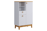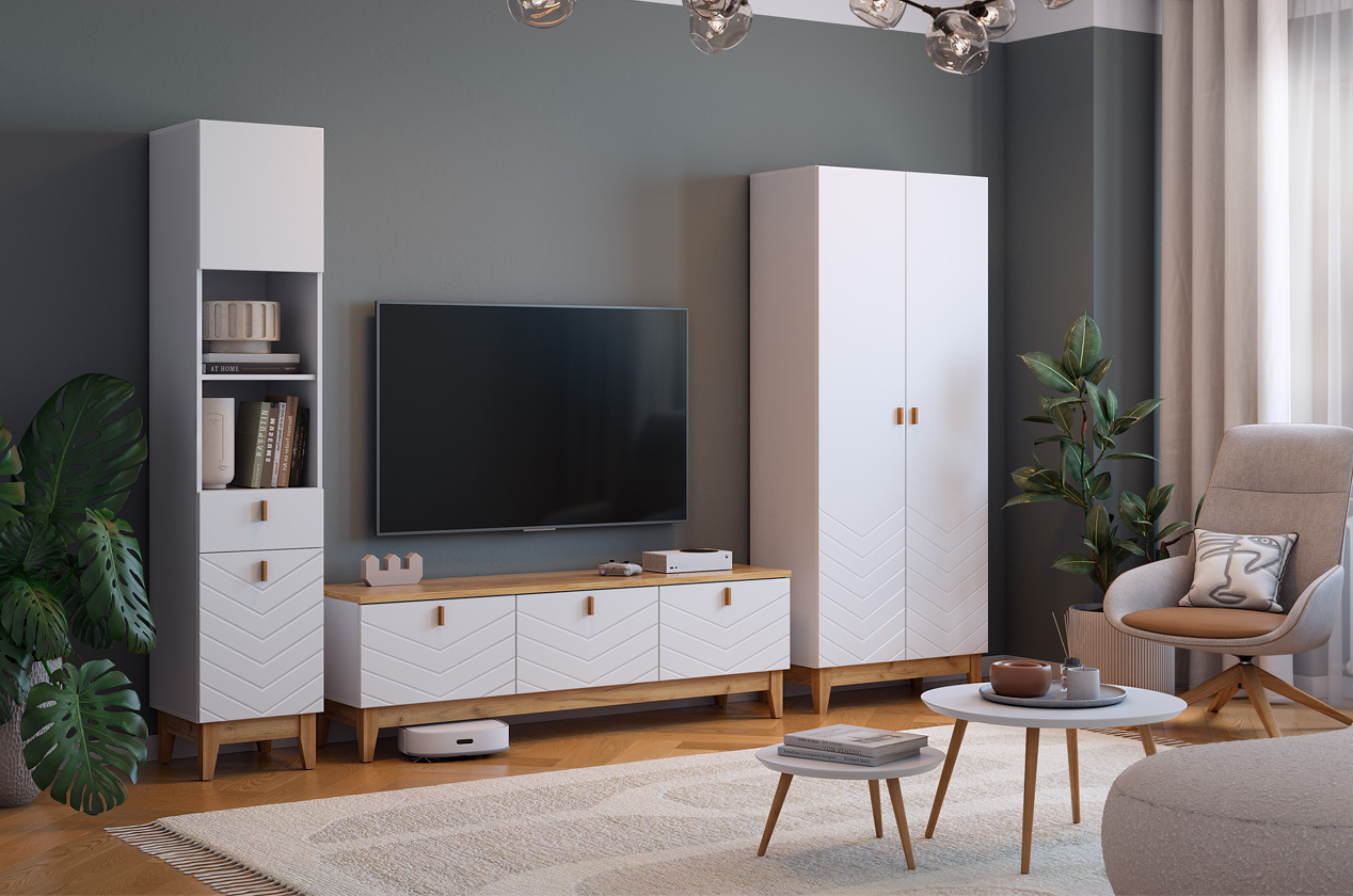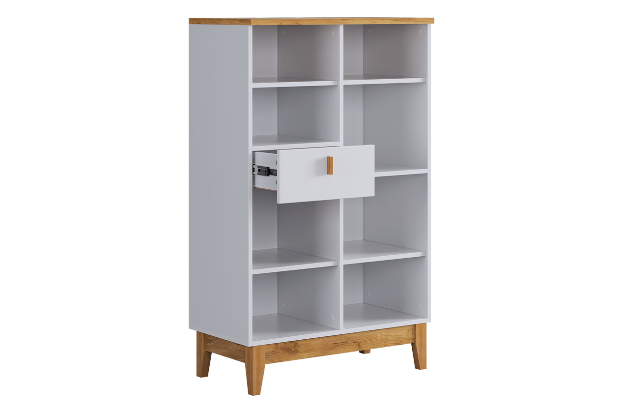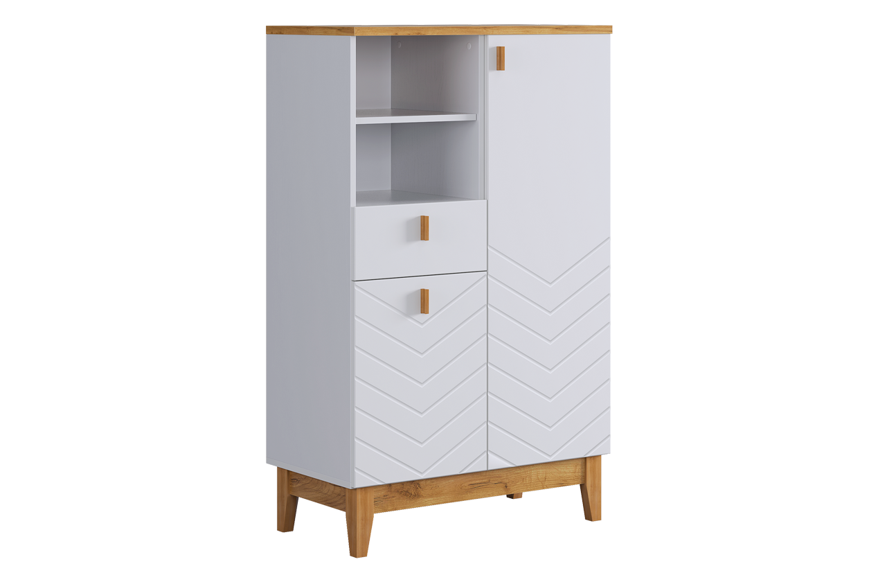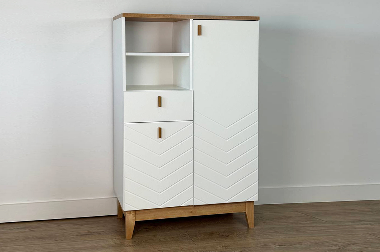Асимметричный комод в скандинавском стиле, предлагающий комбинированную систему хранения. Модель идеально подходит для организации порядка в гостиной, спальне или прихожей, сочетая открытые и закрытые секции для максимальной функциональности.