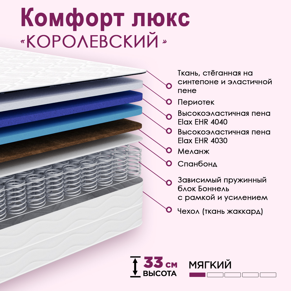 Каждая пружина помещена в независимый тканевый чехол которая имеет приталенный силуэт, что помогает пружине сжиматься строго вертикально при любых нагрузках. Количество пружин на км м. 256 шт. В основе матраса блок высокоэластичной пены «Elax» с высокой плотностью, прослужит вам долгий срок.