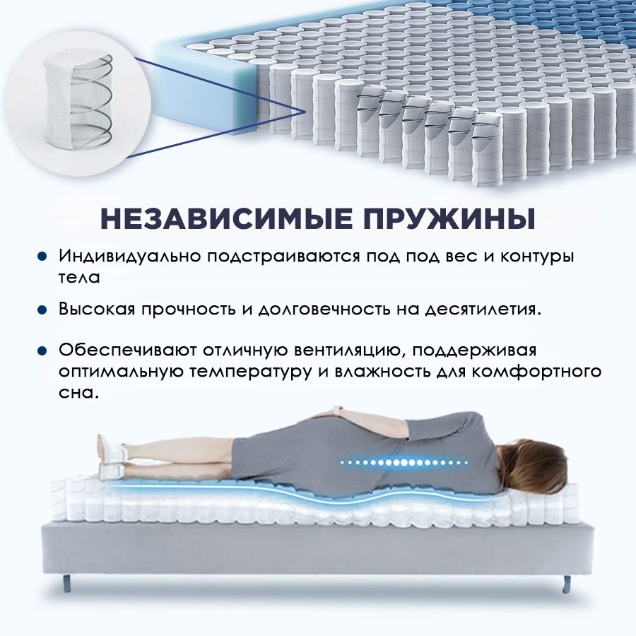 • Каждая пружина работает автономно, точно распределяя нагрузку в соответствии с вашим весом и анатомией. Конструкция блока способствует постоянному воздухообмену, создавая здоровый микроклимат для сна.