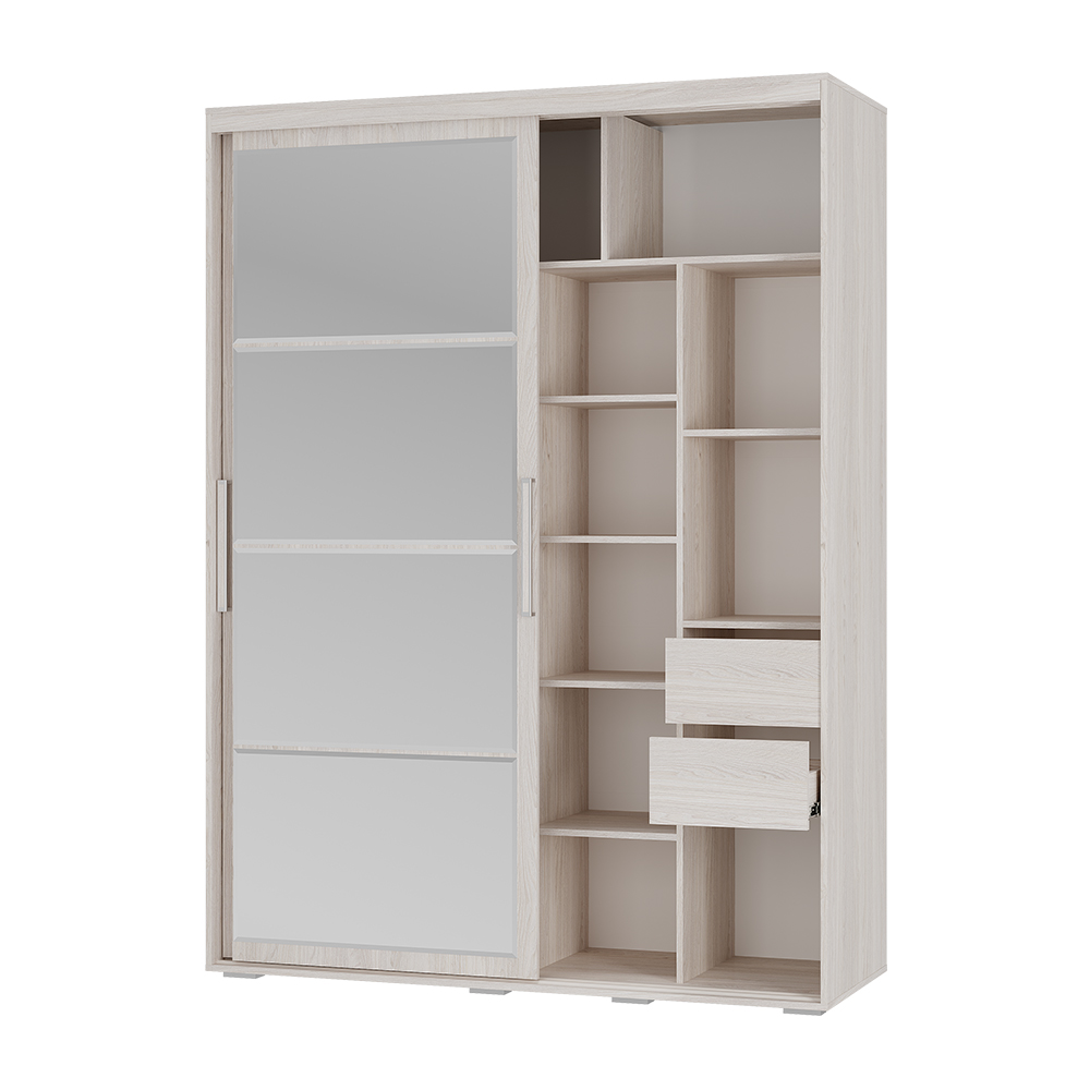 • Грамотное наполнение: Внутри предусмотрено всё необходимое — плательный отсек с хромированной штангой (772 мм), два выдвижных ящика, антресоль и вместительные полки.