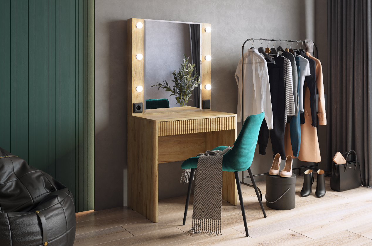 • Столешница: ЛДСП 16 мм, достаточно просторная для размещения косметики и аксессуаров.