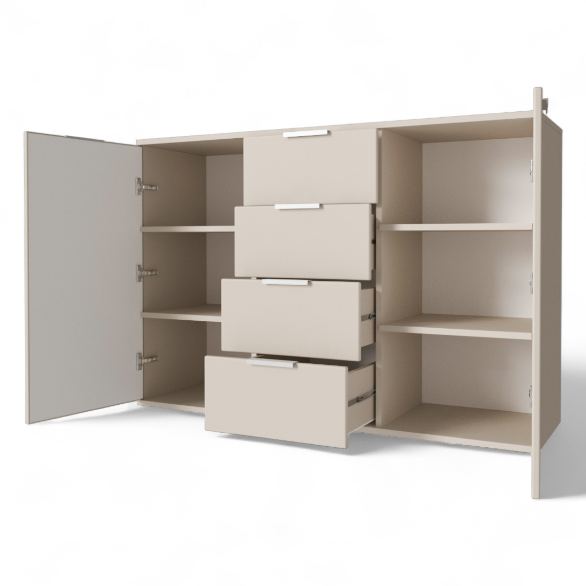 Вместительное хранение: 4 выдвижных ящика и 2 распашные дверцы с 3 полками за каждой.